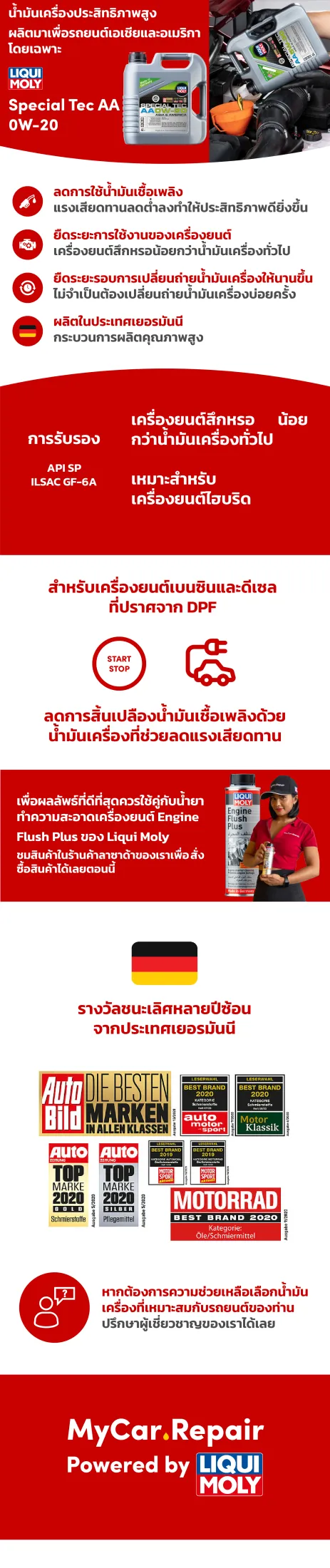 น้ำมันเครื่อง Liqui Moly Special Tec AA 0W-20 เกรดสังเคราะห์แท้ สามารถวิ่งได้ระยะสูงสุด 15,000 กม. พร้อมคุณสมบัติพิเศษในการปกป้องการสึกหรอ ช่วยลดการสิ้นเปลืองน้ำมันเชื้อเพลิง ให้การหล่อลื่นเครื่องยนต์อย่างรวดเร็วและสะอาด